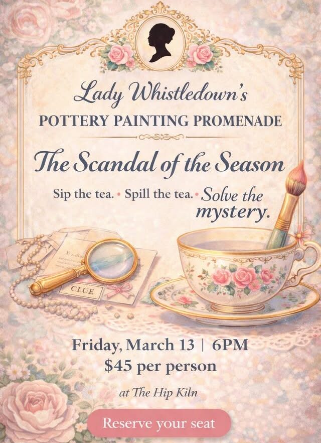 Step into an evening of elegance, creativity, and intrigue at The Hip Kiln. Inspired by the world of Lady Whistledown, this immersive event invites guests to sip tea, paint their own teacup and saucer, and take part in a playful society scandal waiting to be uncovered.